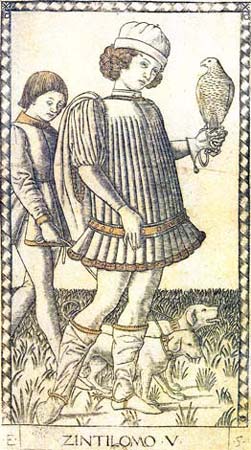 O Gentil-homem em situação de caça segura um falcão com a mão enluvada e é seguido por um pagem que conduz dois cães. É a própria representação de um nobre numa de suas atividades. |