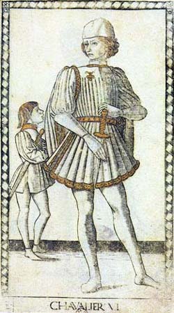A adaga e a espada (carregada por um pagem) são atributos habituais do Cavaleiro, a serviço do direito e da defesa dos fracos. Na tradição cristã, a espada é a arma nobre dos cavaleiros e heróis. |