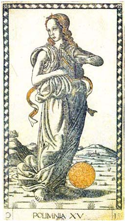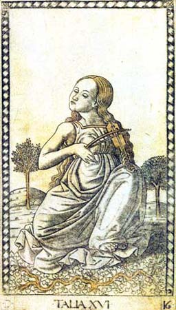Assentada na paisagem, toca uma pequena viola ou "rabeca para dançar". A seus pés, o tapete de hera simboliza a glória. É a única sem esfera (celeste), pois era considerada Musa da Terra. |