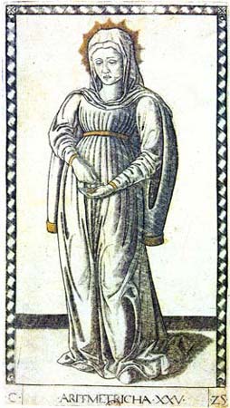 A Aritmética conta algumas peças que passa de uma das mãos à outra. Uma auréola envolve seus cabelos. |