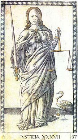 Esta figura é tradicional. A espada simboliza o poder da Justiça que se aplica ao culpado. A balança significa o equilíbrio do julgamento.