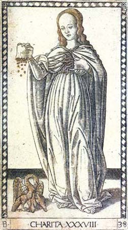 A Caridade despeja sua bolsa repleta de moedas e, com a outra mão, entreabre seu peito de onde brotam chamas, símbolo do amor. O pelicano, que alimenta seus filhotes, lembra o amor de Cristo pelos homens, amor que pode ir até a dádiva de si-mesmo. |