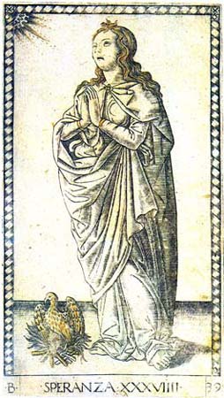 A Esperança está numa atitude de prece, de espera, com as mãos juntas e o rosto levantado para uma luz divina. O fênix, que se consome a seus pés, é o pássaro místico do deserto árabe que se queimava e renascia das cinza. |