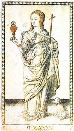 A Fé traz uma cruz numa das mãos e, com a outra, levanta o cálice com a hóstia: símbolos da morte da Cristo e de sua eterna presença entre os homens.