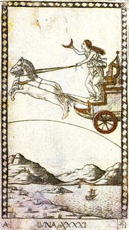 O Crescente, na mão da personagem, é atributo de Diana, a deusa grega associada à Lua. A carruagem indica seu rápido percurso pelo zodíaco e as águas representam o seu reino essencial. |