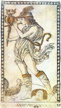 O deus está representado com vários de seus atributos tradicionais: o caduceu, a flauta, o galo, a cabeça de Argus, as asas no capacete e nos pés. Ele pertence ao segundo céu do mundo celeste. |