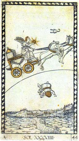 Hélio, o deus alado conduz a carruagem puxada por quatro cavalos dotados de grande rapidez. Escorpião, no alto, assinala o equinócio de outono. A criança em queda é Faetonte, filho de Hélio; trata-se do condutor desastrado fulminado por Zeus. |