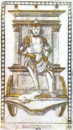 Esta representação está próxima do Imperador do jogo de Tarot e do Rei de Espadas do Tarot Visconti-Sforza. |