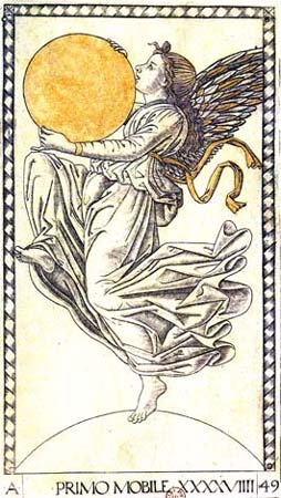O personagem alado, numa atitude de vôo ou de movimento, aciona um invisível sistema rotativo com os pés e segura nas mãos uma esfera tranparente. Representa a nona esfera do universo medieval: o Cristalino do Primeiro Móbil. Essa esfera cristalina é invisível e está em contato direto com Deus, a Primeira Causa, que lhe transmite o movimento. |