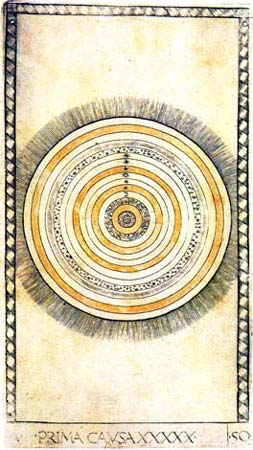 Representa a visão do universo no século 15, que colocava a Terra como centro imóvel do universo, cercada de água, ar e fogo. Quanto ao mundo celeste, era composto de nove céus superpostos conduzidos pelas hierarquias celeste. Além das esferas dos planetas – Lua, Mercúrio, Vênus, Sol, Marte, Júpiter e Saturno – brilha a esfera das Estrelas fixas ou céu estrelado. Por fim o Cristalino ou Primeiro Móbil e o Empíreo ou Primeira Causa. |
