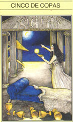 | Assim, o Cinco de Copas fala em confiança traída, em mágoas e tristezas profundas. Também a culpa pela desconfiança e pelo que poderia ter sido diferente. Há o sentimento de perda e a certeza de que agora algo se perdeu. Aqui, a incerteza sobre ter a pessoa que se ama de volta e a certeza de que o encantamento se desfez. A desolação pode ser tão grande e a dor tão profunda que fica difícil seguir adiante e podemos perder tempo demais lamentando pelo que já passou, mas este também pode ser o preço que se paga para sair da fantasia e conhecer a realidade. Quando conseguimos seguir adiante, começamos a refletir sobre como resgatar o que se perdeu, como recuperar o tempo perdido e como fazer diferente daqui por diante. |